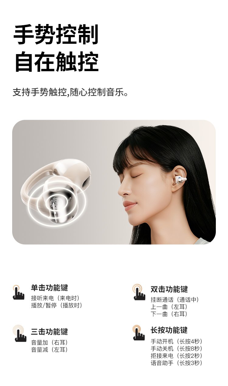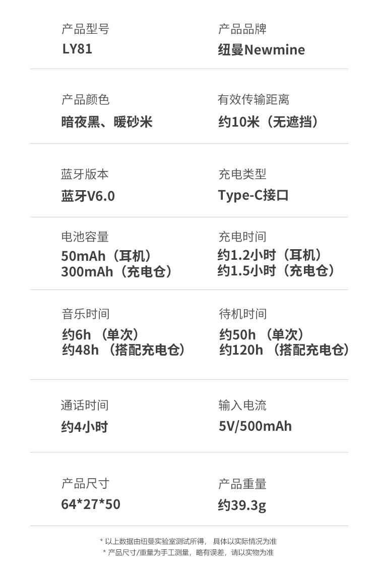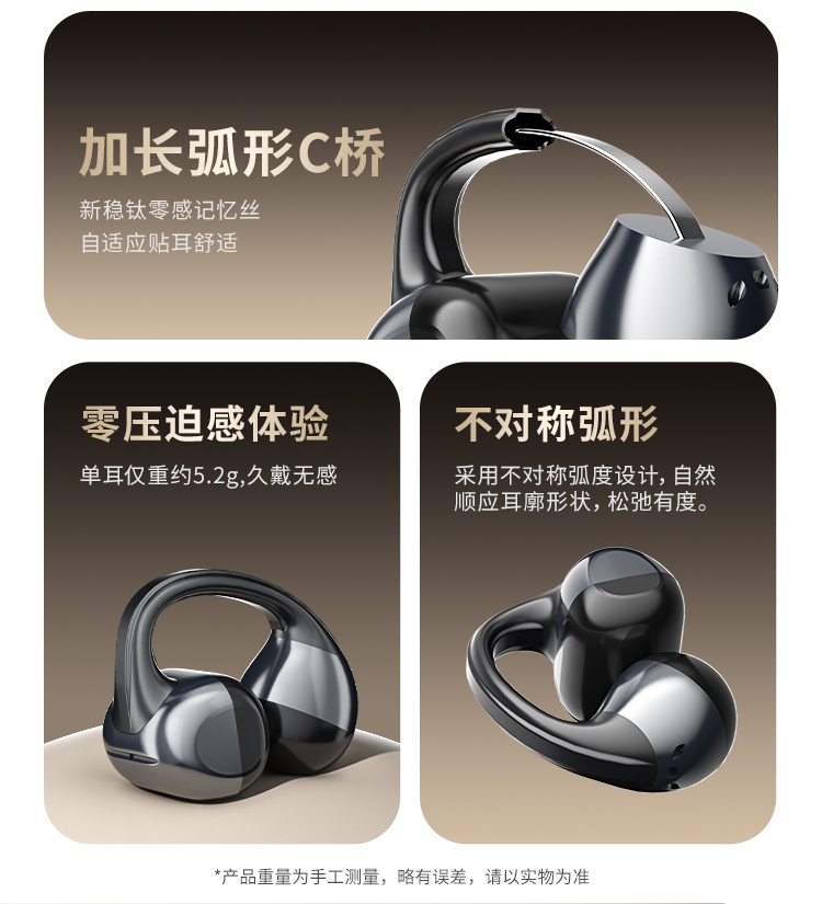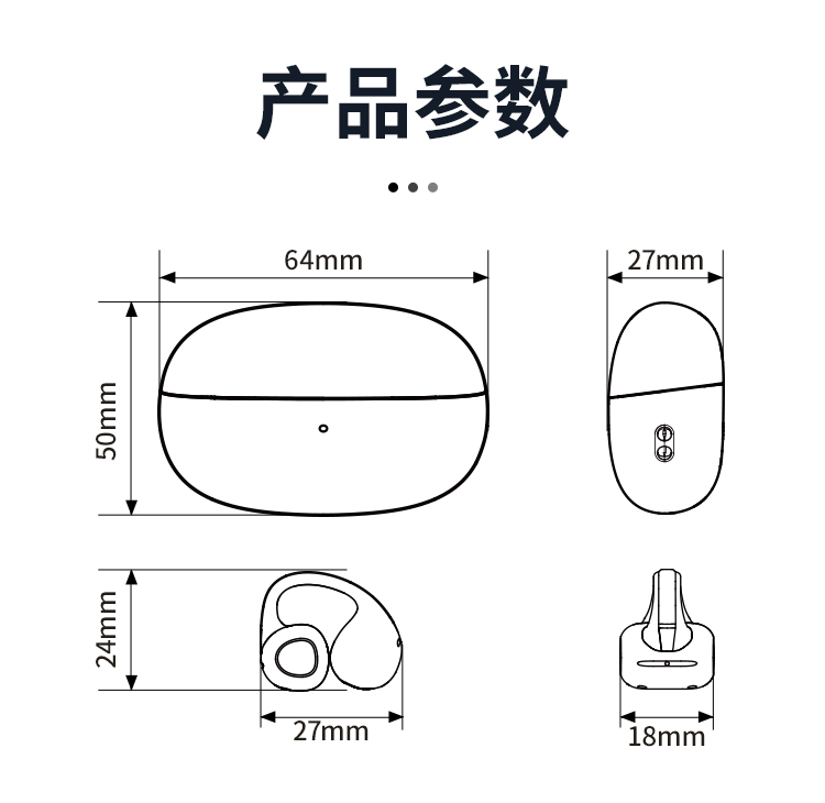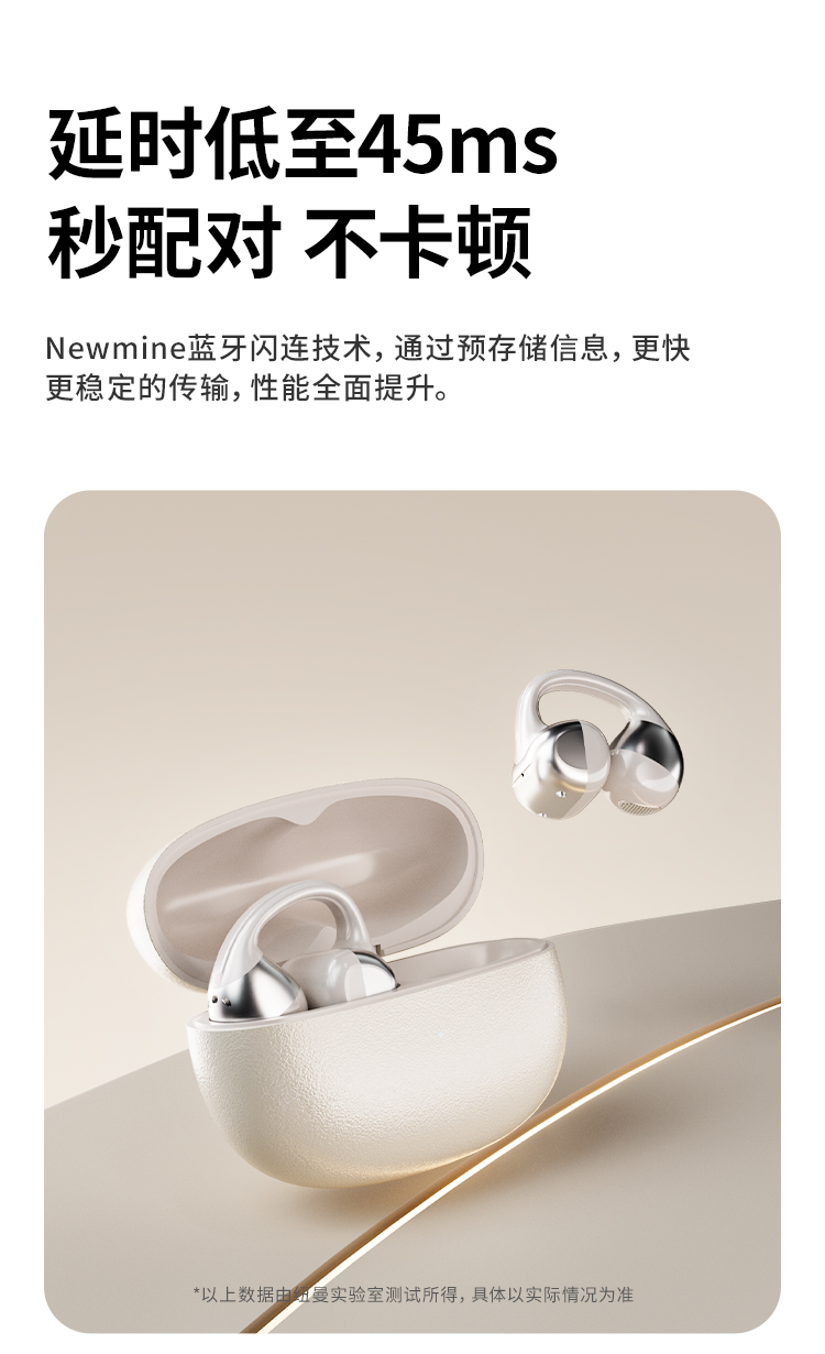 芯片:中科藍(lán)訊AB57560 夾耳耳機(jī) 藍(lán)牙版本:V6.0藍(lán)牙協(xié)議:A2DP/AVRCP/HSP/HFP 頻率響應(yīng):100HZ-20KHZ 喇叭單元:全頻喇叭中11mm 15mW額度功率” 電池容量:充電倉300mAh,耳機(jī)50mAh*2 音樂時(shí)長(zhǎng):約6h(單次),搭配充電倉48g 產(chǎn)品尺寸:64*27*50mm產(chǎn)品重量“39.9g